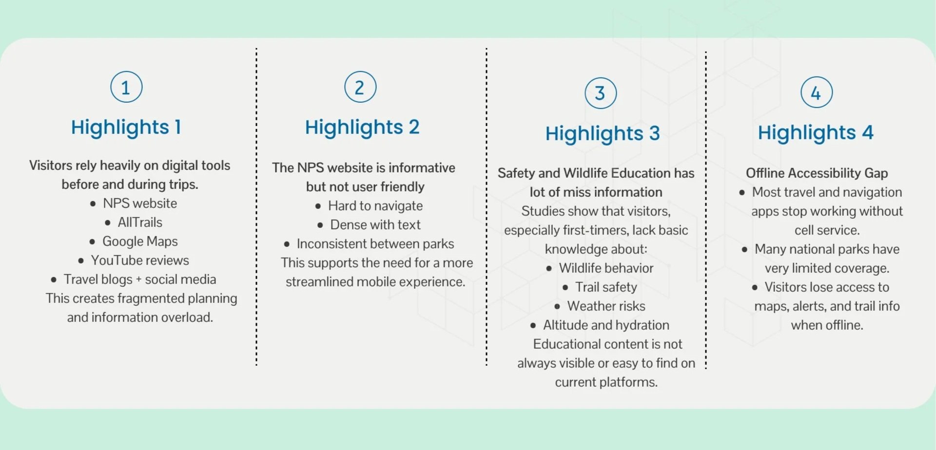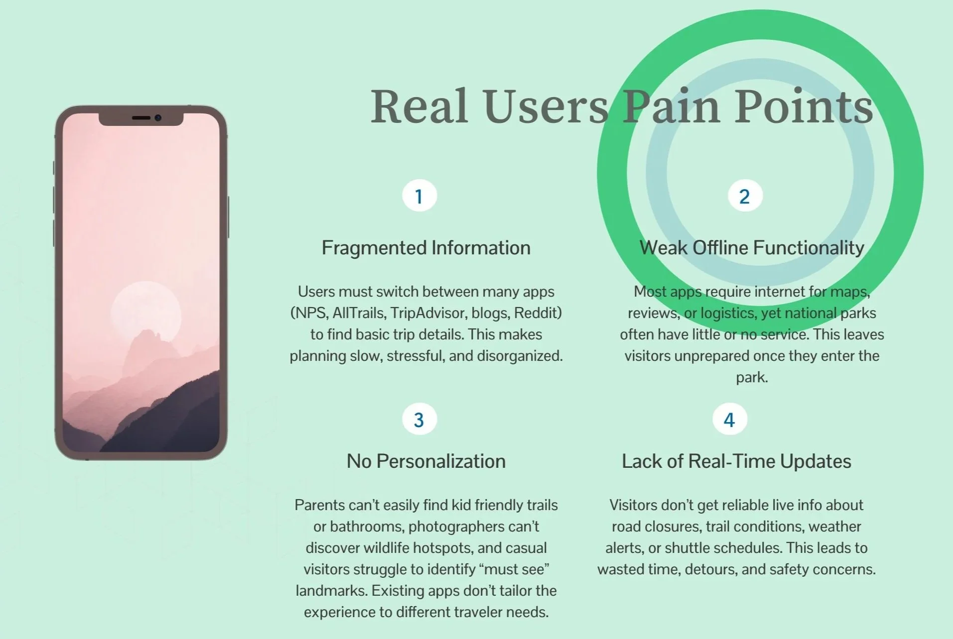 National park visitation is growing, reaching a record 331.9 million visits in 2024. Planning trips is challenging because information is spread across many platforms like NPS sites, AllTrails, Google Maps, and others. This makes it time-consuming and confusing, especially for beginners and casual visitors.