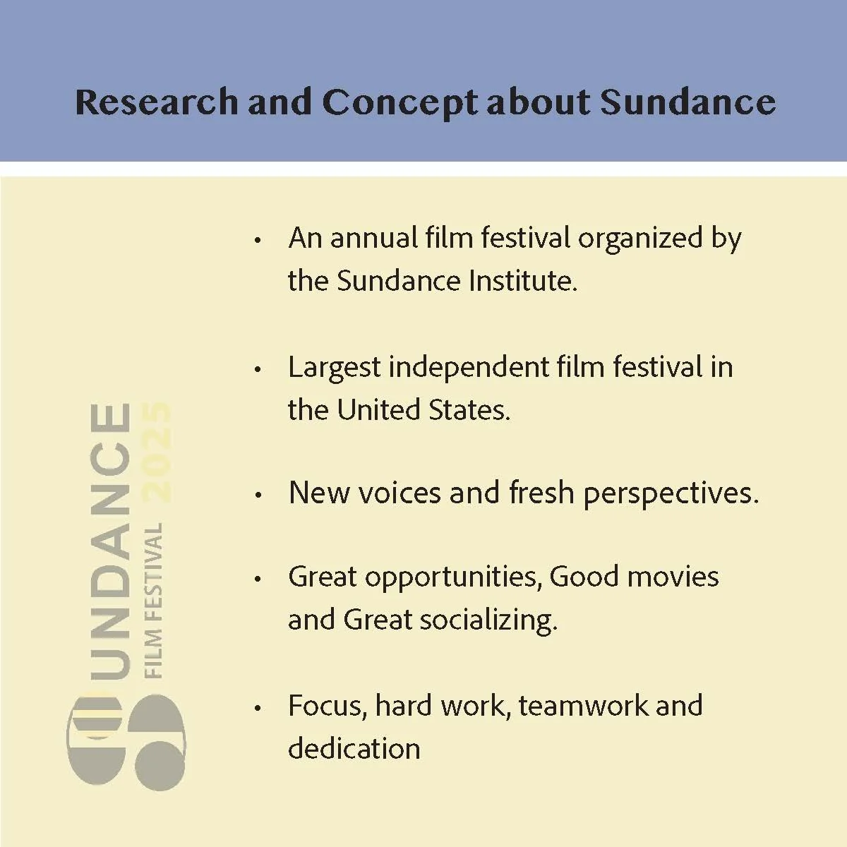 The festivals provide an opportunity for filmmakers, distributors, critics and other interested persons to attend films and meet to discuss current artistic developments in film. Which means, Sundance offers great opportunities, good movies and also great socializing. It also takes a lot of hard work, focus and dedication to organize and present a movie in the festival.